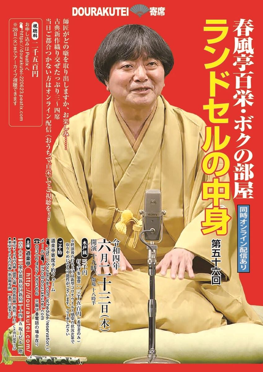春風亭百栄 ボクの部屋『ランドセルの中身』【配信あり】 22/6/23(木)~22/6/28(火) 道楽亭(Ryu's Bar)、 その他生配信 シェア ツイート 上演情報 ジャンル 落語/演芸 打ち上げあり(希望者のみ)参加費-3,500円 料金 木戸銭-3,000円【配信公演】オンライン視聴料-2,500円 キャスト&スタッフ 出演 春風亭百栄 お問い合わせ 道楽亭 公式サイト シェア ツイート