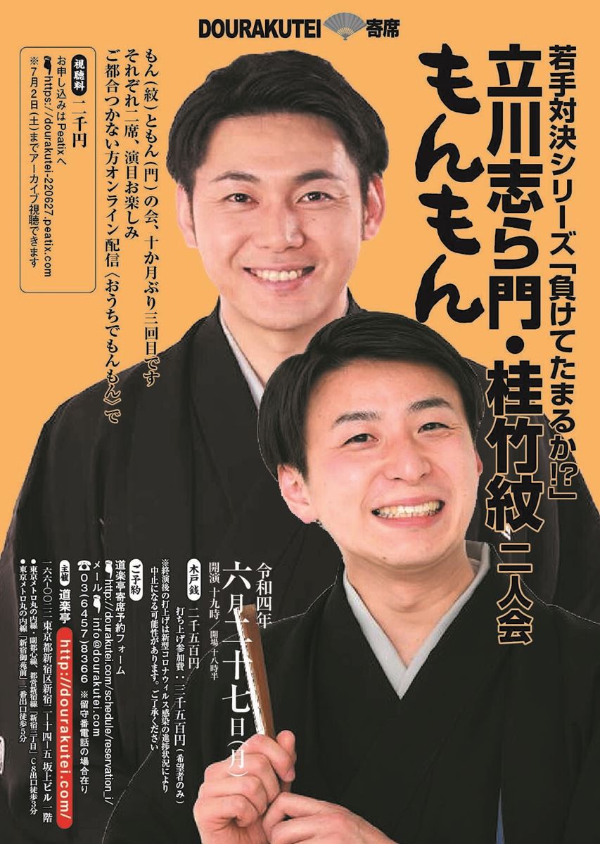 若手対決シリーズ「負けてたまるか!?」立川志ら門・桂竹紋 二人会『もんもん』【配信あり】 22/6/27(月)~22/7/2(土) 道楽亭(Ryu's Bar)、 その他生配信 シェア ツイート 上演情報 ジャンル 落語/演芸 打ち上げあり(希望者のみ)参加費-3,500円 料金 木戸銭-2,500円【配信公演】オンライン視聴料-2,000円 キャスト&スタッフ 出演 立川志ら門 桂竹紋 お問い合わせ 道楽亭 公式サイト シェア ツイート