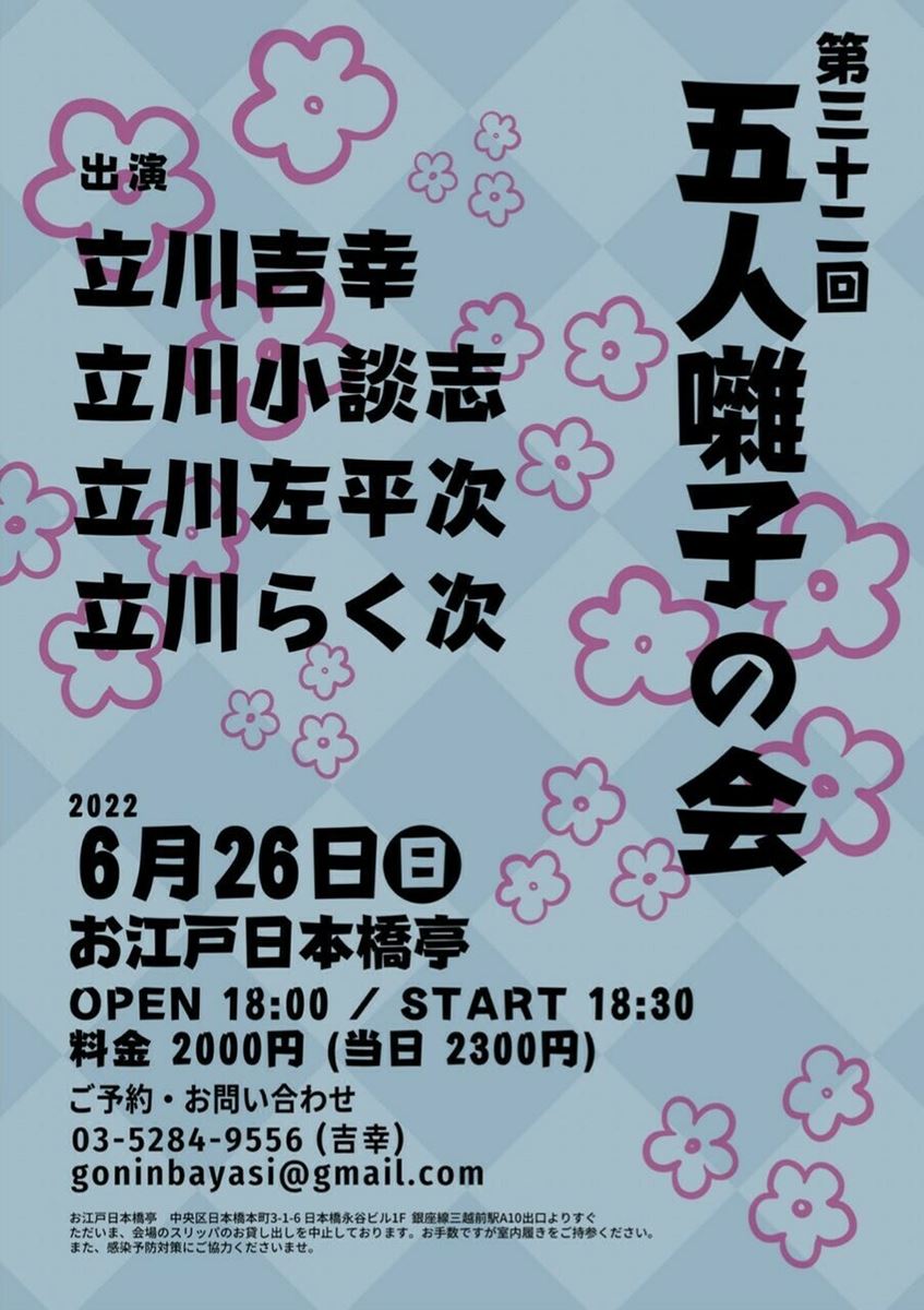 五人囃子の会 22/6/26(日) お江戸日本橋亭 シェア ツイート 上演情報 ジャンル 落語/演芸 料金 前売-2,000円当日-2,300円 キャスト&スタッフ 出演 立川吉幸 立川小談志 立川左平次 立川らく次 お問い合わせ 立川吉幸 立川小談志 公式サイト シェア ツイート