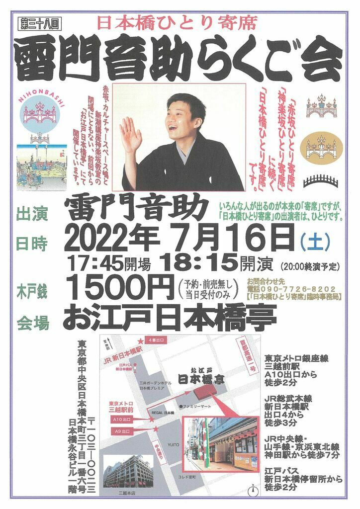 日本橋ひとり寄席 雷門音助らくご会 22/7/16(土) お江戸日本橋亭 シェア ツイート 上演情報 ジャンル 落語/演芸 20:00終演予定 料金 一般-1,500円 全席自由 キャスト&スタッフ 出演 雷門音助 お問い合わせ 「日本橋ひとり寄席」臨時事務局 公式サイト シェア ツイート
