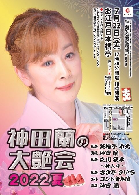 お江戸日本橋亭 神田蘭の大艶会・2022夏 22/7/22(金) お江戸日本橋亭 シェア ツイート 上演情報 ジャンル 落語/演芸 料金 前売-1,500円当日-2,000円 キャスト&スタッフ 出演 笑福亭希光 神田蘭 立川談幸 古今亭今いち コント青年団 お問い合わせ 落語芸術協会 お江戸日本橋亭 10:00~18:00 公式サイト シェア ツイート