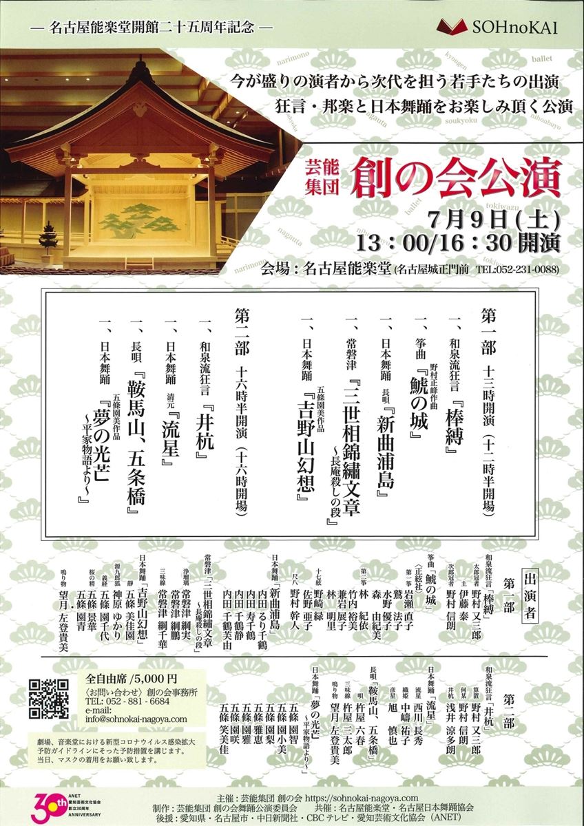 芸能集団創の会公演 名古屋能楽堂開館二十五周年記念 22/7/9(土) 名古屋能楽堂 シェア ツイート 演目【第一部】和泉流狂言『棒縛』筝曲『鯱の城』日本舞踊 長唄『新曲浦島』常磐津『三世相錦繡文章~長安殺しの段』日本舞踊『吉野山幻想』【第二部】和泉流狂言『井杭』日本舞踊 清元『流星』長唄『鞍馬山、五条橋』日本舞踊『夢の光芒~平家物語より~』 上演情報 ジャンル 能/狂言 料金 一般-5,000円 全席自由 キャスト&スタッフ 出演 野村又三郎 [出演]野村又三郎 / 岩瀬直子 / 内田るり千鶴 / 他 お問い合わせ 創の会事務所 創の会事務所 公式サイト シェア ツイート