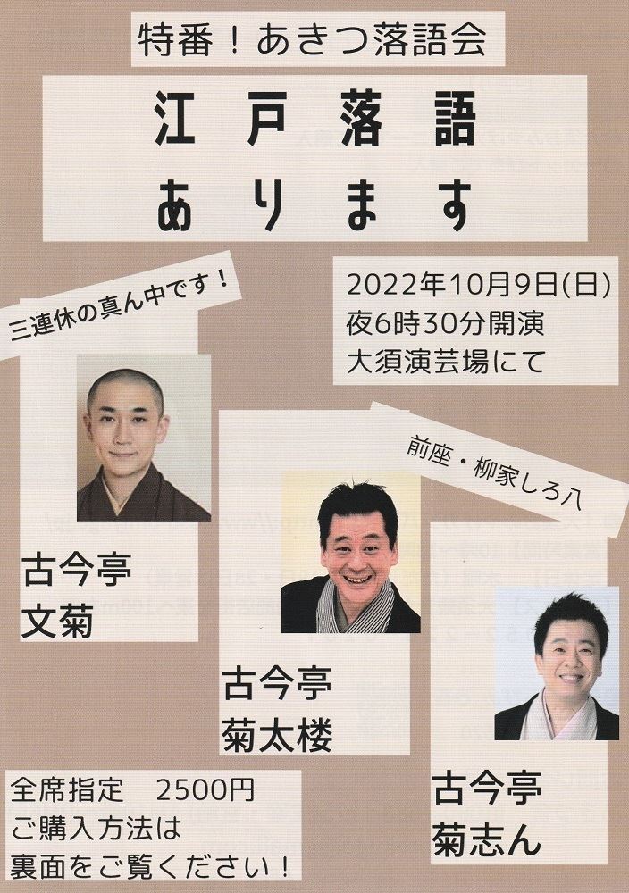 特番!あきつ落語会 江戸落語あります 22/10/9(日) 大須演芸場 シェア ツイート 上演情報 ジャンル 落語/演芸 未就学児童は入場不可。 料金 一般-2,500円 全席指定 表示できるチケット情報はありません詳しくはこちら キャスト&スタッフ 出演 古今亭菊志ん 古今亭菊太楼 古今亭文菊 柳家しろ八 お問い合わせ あきつ舎 10:00~18:00 あきつ舎 公式サイト シェア ツイート