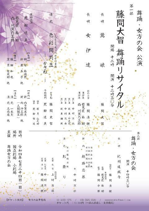 舞踊・女方の会公演 22/7/24(日) 国立劇場 小劇場 シェア ツイート 女方を生業とする日本舞踊家・歌舞伎俳優によるジャンルを超えた舞踊集団。 上演情報 ジャンル 歌舞伎 会場の入場及び再入場の際にチケットが必要。劇場内では必ずマスクをご着用ください。客席でのお食事・会話はお控えください。その他のお願いや対策は劇場HP等をご確認の上、ご来場ください。 料金 一般-10,000円 全席指定 表示できるチケット情報はありません詳しくはこちら キャスト&スタッフ 出演 藤間清継 中村京妙 上村吉弥 藤間大智 [出演]藤間清継 / 中村京妙 / 上村吉弥 / 藤間大智 お問い合わせ 舞踊女方の会事務局 シェア ツイート