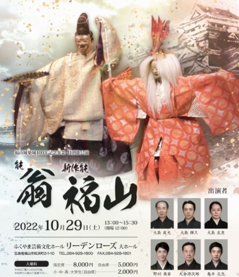 福山城築城400年記念事業 特別能公演 22/10/29(土) ふくやま芸術文化ホール リーデンローズ 大ホール シェア ツイート 福山城築城400年記念の特別能公演。翁が寿ぎ、朱雀神が天空を舞う。必見の舞台です! 上演情報 ジャンル 歌舞伎 幼児の入場はご遠慮ください。翁の上演中は客席への入退場ができません。開演までにご着席下さい。 料金 一般-8,000円 全席指定 表示できるチケット情報はありません詳しくはこちら キャスト&スタッフ 出演 大島政允 大島輝久 大島衣恵 野村萬斎 大倉源次郎 [出演]大島政允 / 大島輝久 / 大島衣恵 / 野村萬斎 / 大倉源次郎 お問い合わせ 喜多流大島能楽堂 シェア ツイート