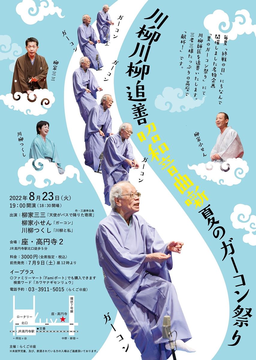川柳川柳追善 昭和音曲噺 夏のガーコン祭り 22/8/23(火) 座・高円寺2 シェア ツイート 演目『天使がバスで降りた寄席』『ガーコン』『川柳と私』 上演情報 ジャンル 落語/演芸 料金 一般-3,000円 全席指定未就学児童の入場は不可 キャスト&スタッフ 出演 柳家三三 柳家小せん 川柳つくし お問い合わせ らくご@座 公式サイト シェア ツイート