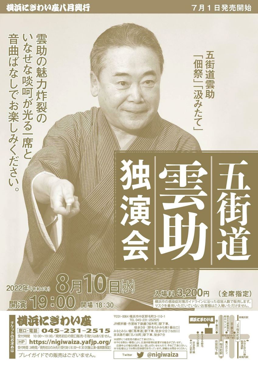 五街道雲助独演会 22/8/10(水) 横浜にぎわい座 芸能ホール シェア ツイート 演目『佃祭』『汲みたて』 上演情報 ジャンル 落語/演芸 料金 一般-3,200円 全席指定 キャスト&スタッフ 出演 五街道雲助 お問い合わせ 横浜にぎわい座 10:00~19:00 公式サイト シェア ツイート