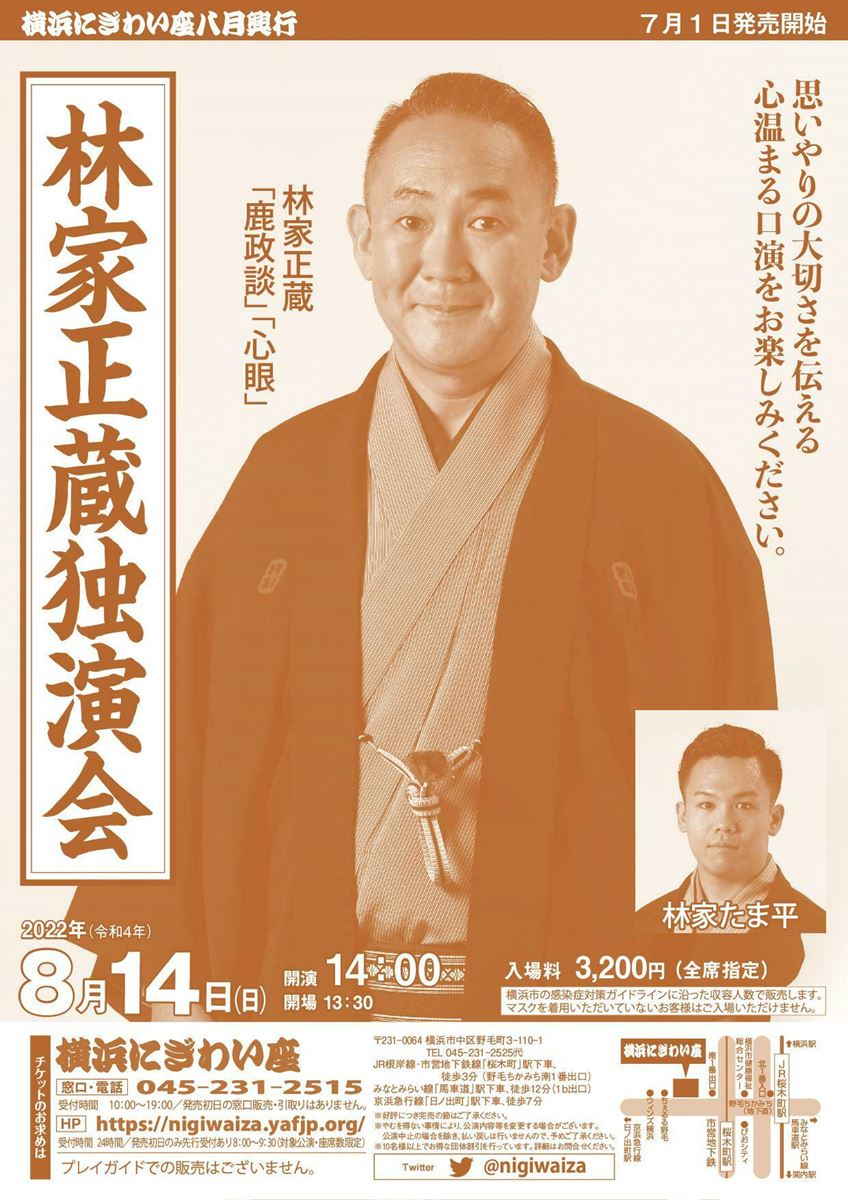 林家正蔵独演会 22/8/14(日) 横浜にぎわい座 芸能ホール シェア ツイート 演目『鹿政談』『心眼』 上演情報 ジャンル 落語/演芸 料金 一般‐3,200円 全席指定 キャスト&スタッフ 出演 林家正蔵 林家たま平 お問い合わせ 横浜にぎわい座 10:00~19:00 公式サイト シェア ツイート