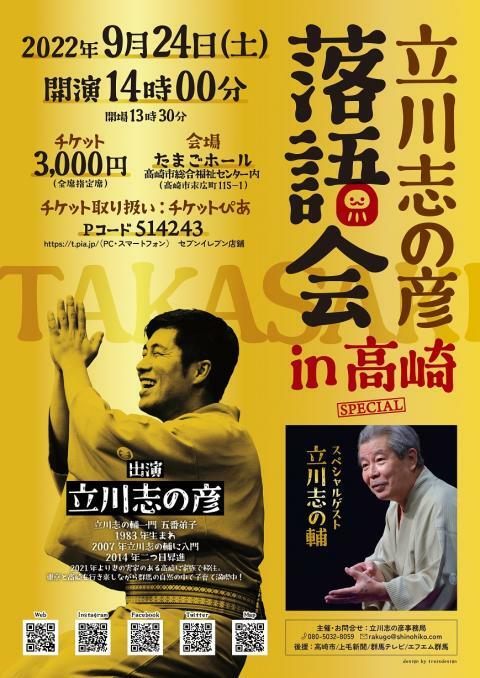 立川志の彦落語会 in 高崎 22/9/24(土) 高崎市総合福祉センター たまごホール シェア ツイート 立川志の彦による高崎での定期公演。 上演情報 ジャンル 落語/演芸 未就学児童は入場不可。会場内ではマスクの着用をお願いいたします。消毒と検温にご協力お願いいたします。 料金 一般-3,000円 全席指定 表示できるチケット情報はありません詳しくはこちら キャスト&スタッフ 出演 立川志の彦 立川志の輔 お問い合わせ 立川志の彦事務局 シェア ツイート