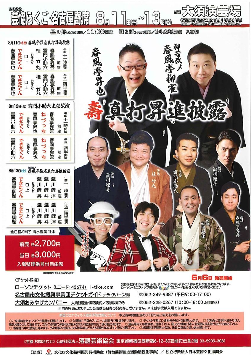 2022芸協らくご・名古屋寄席 壽真打昇進披露 22/8/11(木)~22/8/13(土) 大須演芸場 シェア ツイート 上演情報 ジャンル 落語/演芸 料金 一般-2,700円 全席自由・整理番号付当日+300円未就学児童は入場不可 キャスト&スタッフ 出演 春風亭昇吾 雷門小助六 桂竹丸 できたくん 春風亭昇也 ねづっち 春風亭鯉づむ 瀧川鯉斗 瀧川鯉昇 桂伸び太 お問い合わせ 公益社団法人落語芸術協会 10:00~18:00 公式サイト シェア ツイート