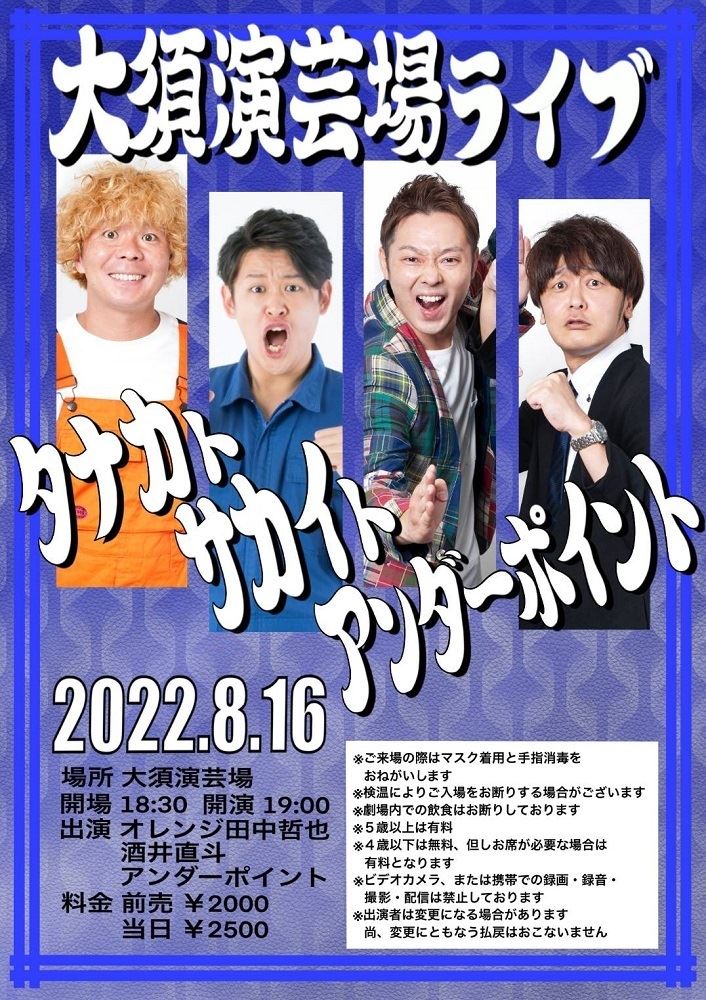 大須演芸場ライブ タナカト サカイト アンダーポイント 22/8/16(火) 大須演芸場 シェア ツイート 上演情報 ジャンル お笑い 料金 前売-2,000円当日-2,500円 4歳以下は無料。席が必要な場合は別途チケットが必要車いすで来場の際はチケット購入時に問い合わせ先まで要問合せ キャスト&スタッフ 出演 酒井直斗 アンダーポイント [出演]酒井直斗 / アンダーポイント / オレンジ田中哲也 お問い合わせ FANYチケット問合せダイヤル 10:00~19:00 公式サイト シェア ツイート