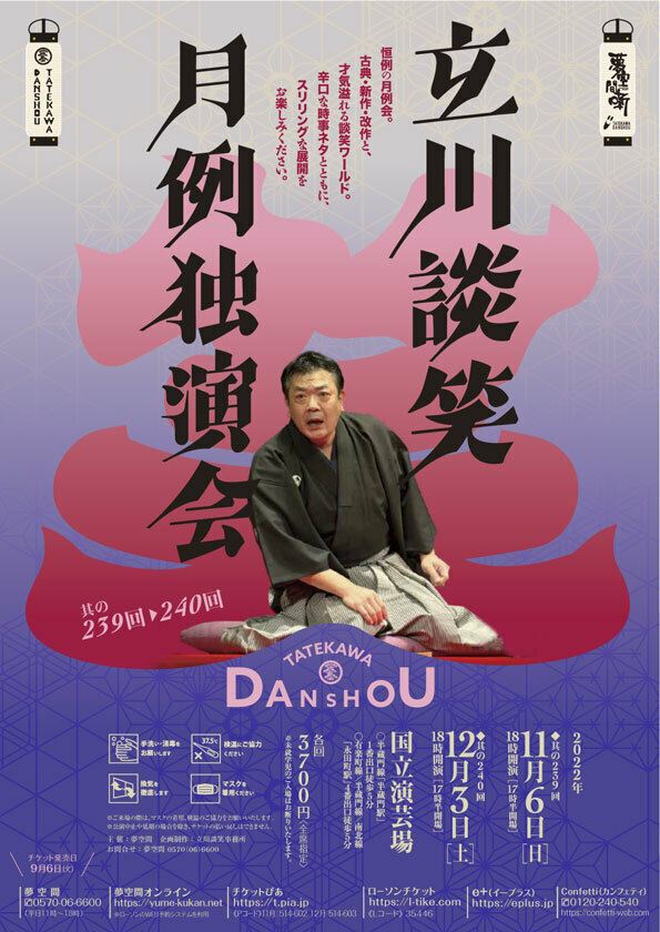 立川談笑 月例独演会 其の239回 22/11/6(日) 国立演芸場 シェア ツイート 上演情報 ジャンル 落語/演芸 未就学児童は入場不可。 料金 一般-3,700円 全席指定 表示できるチケット情報はありません詳しくはこちら キャスト&スタッフ 出演 立川談笑 [出演]立川談笑 お問い合わせ 夢空間 公式サイト シェア ツイート