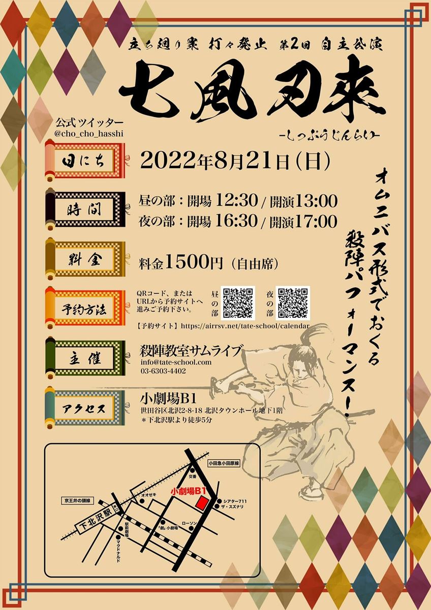 殺陣教室サムライブ 立ち廻り衆 打々発止『七風刃來』 22/8/21(日) 小劇場B1 シェア ツイート 上演情報 ジャンル 小劇場 料金 一般-1,500円 全席自由 キャスト&スタッフ 作・演出 五代新一 振付 五代新一 [作・演出]五代新一 [振付]五代新一 / 森蔵玄士 / 石川慧 / 渡辺大海 / 中川浩行 [出演]愛桜 / あずさ / 亀丸 / 他 お問い合わせ 殺陣教室サムライブ 公式サイト シェア ツイート
