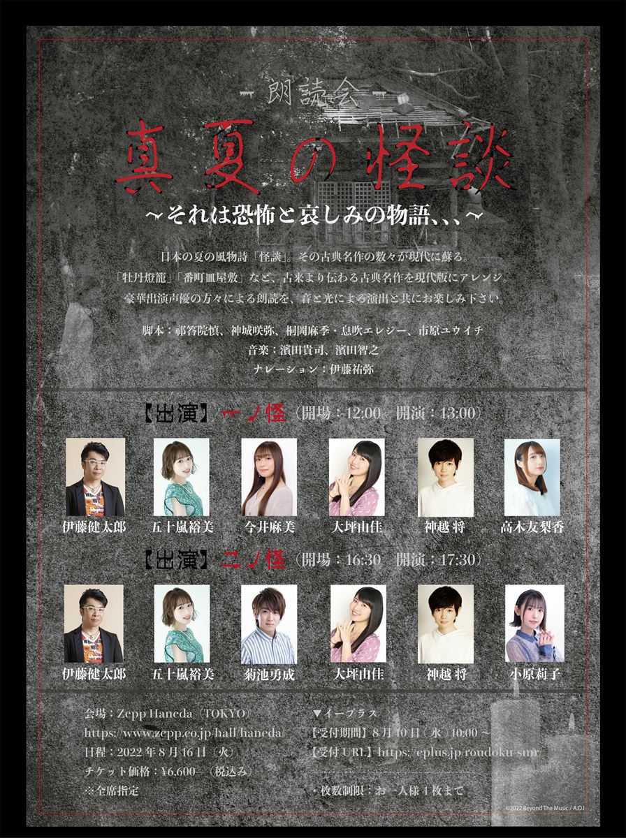 朗読会『真夏の怪談 ~それは恐怖と悲しみの物語、、、~』 22/8/16(火) Zepp Haneda(TOKYO) シェア ツイート 上演情報 ジャンル 小劇場 未就学児童は入場不可。客席を含む会場内の映像・写真が公開されることがあります。公演内容に関する詳細はhttps://info.diskgarage.com/まで。 料金 当日引換券-6,600円 全席指定当日引換券:ドリンク代別途必要 表示できるチケット情報はありません詳しくはこちら キャスト&スタッフ 脚本 祁答院慎 出演 伊藤健太郎 五十嵐裕美 今井麻美 大坪由佳 神越将 高木友梨香 菊池勇成 小原莉子 [脚本]祁答院慎 / 神城咲弥 / 桐岡麻季 / 息吹エレジー / 他[出演]伊藤健太郎 / 五十嵐裕美 / 今井麻美 / 他 お問い合わせ ディスクガレージ 12:00~15:00・土日祝休 公式サイト シェア ツイート