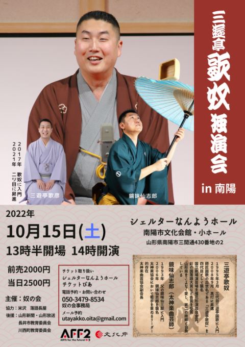 三遊亭歌奴独演会in南陽 22/10/15(土) シェルターなんようホール 小ホール シェア ツイート 三遊亭歌奴が南陽市で初の独演会 上演情報 ジャンル 落語/演芸 料金 一般-2,000円 全席自由 表示できるチケット情報はありません詳しくはこちら キャスト&スタッフ 出演 三遊亭歌奴 鏡味仙志郎 三遊亭歌つを お問い合わせ 奴の会事務局 シェア ツイート