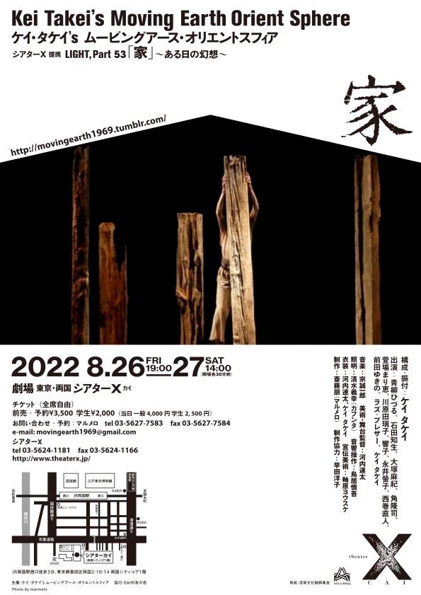 ケイタケイ's ムービングアース・オリエントスフィア 『家』~ある日の幻想~ 22/8/26(金)~22/8/27(土) シアターX(カイ) シェア ツイート 上演情報 ジャンル ダンス/バレエ 小劇場 料金 一般-3,500円学生-2,000円 全席自由当日各+500円 キャスト&スタッフ [構成・振付]ケイタケイ [出演]青柳ひづる / 石田知生 / 大塚麻紀 / 他 お問い合わせ マルメロ マルメロ 公式サイト シェア ツイート