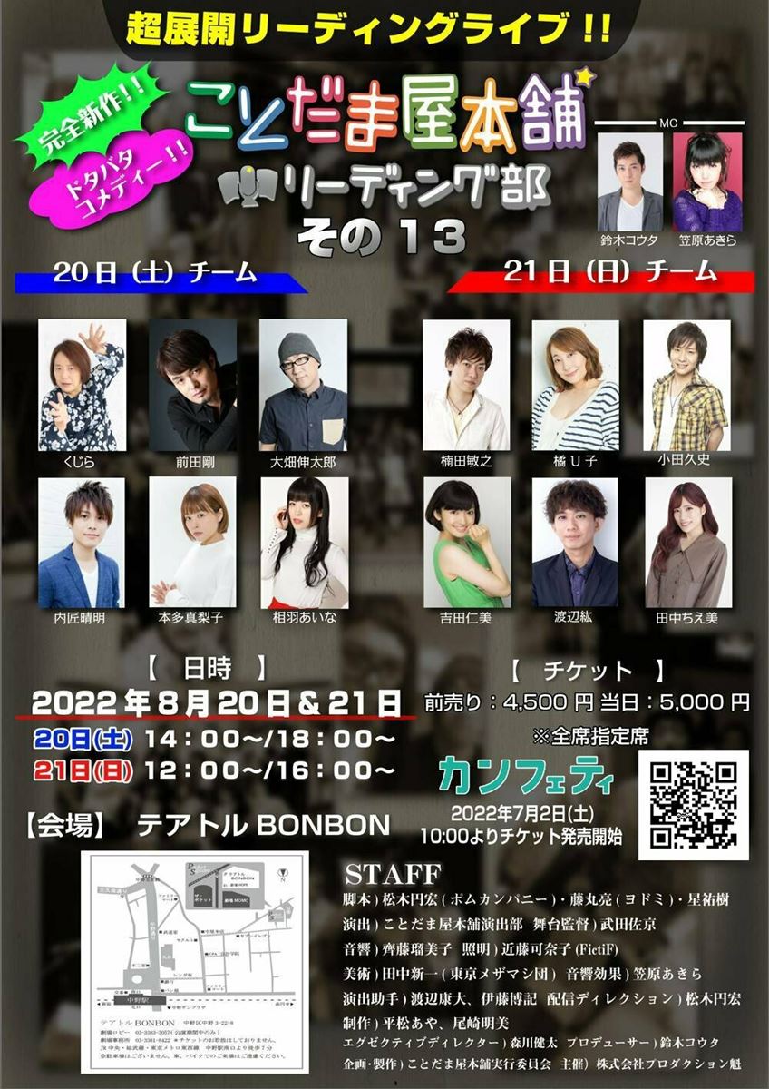 『ことだま屋本舗 リーディング部 その13』【配信あり】 22/8/20(土)~22/8/28(日) テアトルBONBON、 その他生配信 シェア ツイート 上演情報 ジャンル 小劇場 料金 前売-4,500円当日-5,000円【配信公演】配信チケット-2,000円 全席指定 キャスト&スタッフ 脚本 松木円宏 出演 くじら 前田剛 大畑伸太郎 本多真梨子 相羽あいな 楠田敏之 橘U子 吉田仁美 [脚本]松木円宏 / 藤丸亮 / 星祐樹 [演出] ことだま屋本舗演出部 [出演]くじら / 前田剛 / 大畑伸太郎 / 他※公演日時によって出演者が異なります。詳細は公式サイトにてご確認下さい。 公式サイト シェア ツイート