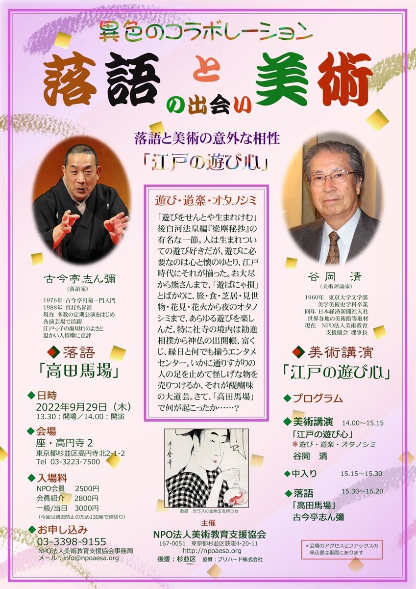 落語と美術の出会い「江戸の遊び心」 22/9/29(木) 座・高円寺2 シェア ツイート 演目美術公演「江戸の遊び心」ー仲入りー落語「高田馬場」 上演情報 ジャンル 落語/演芸 料金 一般-3,000円 キャスト&スタッフ 出演 古今亭志ん彌 お問い合わせ NPO法人 美術教育支援協会 NPO法人 美術教育支援協会 公式サイト シェア ツイート