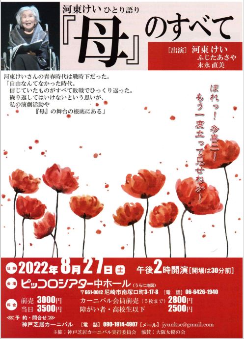 河東けい ひとり語り『「母」のすべて』 22/8/27(土) 兵庫県立尼崎青少年創造劇場 ピッコロシアター 中ホール シェア ツイート 上演情報 ジャンル 小劇場 料金 一般-3,000円障がい者・高校生以下-2,500円 当日+500円 キャスト&スタッフ [出演]河東けい お問い合わせ 神戸芝居カーニバル実行委員会 神戸芝居カーニバル実行委員会 公式サイト シェア ツイート