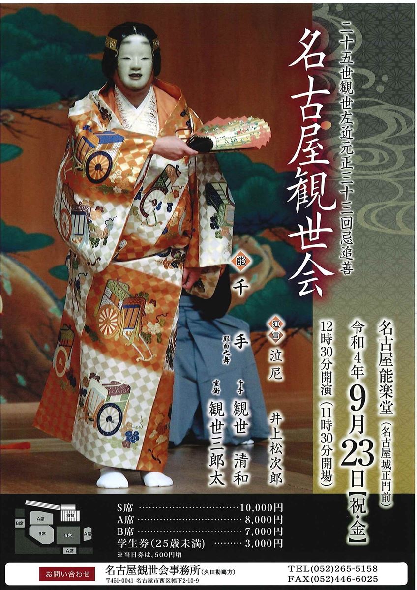 名古屋観世会 22/9/23(金) 名古屋能楽堂 シェア ツイート 演目狂言「泣尼」能「千手」 上演情報 ジャンル 能/狂言 料金 S席-10,000円A席-8,000円B席-7,000円学生券(25歳未満)-3,000円 全席指定当日+500円 キャスト&スタッフ 出演 井上松次郎 観世清和 観世三郎太 [出演]井上松次郎 / 観世清和 / 観世三郎太 お問い合わせ 名古屋観世会 公式サイト シェア ツイート