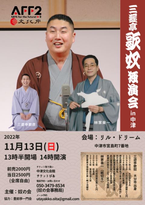 三遊亭歌奴独演会in中津 22/11/13(日) リル・ドリーム シェア ツイート 三遊亭歌奴が中津市で独演会 上演情報 ジャンル 落語/演芸 料金 一般-2,000円 全席自由 表示できるチケット情報はありません詳しくはこちら キャスト&スタッフ 出演 三遊亭歌奴 林家楽一 三遊亭歌つを お問い合わせ 奴の会事務局 シェア ツイート