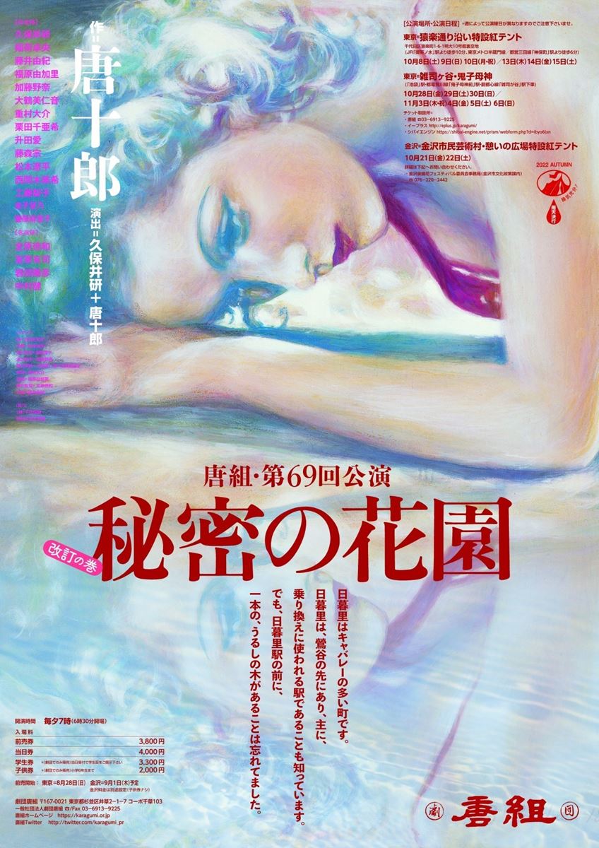 劇団唐組『秘密の花園』 22/10/8(土)~22/11/6(日) 金沢市民芸術村 憩いの広場 特設紅テント、 猿楽通り沿い(御茶ノ水) 特設紅テント、 雑司ヶ谷・鬼子母神 シェア ツイート 上演情報 ジャンル 大・中劇場 当日15:00より受付にて入場整理券と引き換え。小学生未満のお子様の入場はご遠慮ください。 料金 【東京公演】一般-3,800円学生券-3,300円子供券-2,000円【石川公演】一般-3,800円大学生以下-3,000円 全席自由【東京公演】学生券:当日学生証提示子供券:小学6年生まで一般当日+200円 表示できるチケット情報はありません詳しくはこちら キャスト&スタッフ メイン 劇団唐組 お問い合わせ 金沢泉鏡花フェスティバル委員会事務局 (石川公演) 公式サイト シェア ツイート