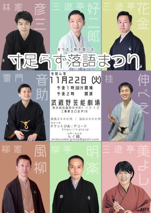 寸足らず落語まつり 22/11/22(火) 武蔵野芸能劇場 小劇場 シェア ツイート 寸足らず・噺を聴く会の特別お祭り公演です。 上演情報 ジャンル 落語/演芸 ※来館時にマスクのご着用・手指消毒・手洗いをお願いしております。※発熱・体調不良の際は来館をお控えください。※感染予防対策をはじめ、やむを得ない事情により、出演者や当日の対応等に変更が生じる可能性がございます。 料金 全席自由-2,500円 表示できるチケット情報はありません詳しくはこちら キャスト&スタッフ 出演 柳家風柳 柳亭明楽 雷門音助 桂伸べえ 三遊亭花金 三遊亭じゃんけん 林家彦星 三遊亭美よし [出演]柳家風柳 / 柳亭明楽 / 雷門音助 / 桂伸べえ / 三遊亭花金 / 三遊亭好二郎 / 林家彦三 / 三遊亭美よし お問い合わせ らく鍋 公式サイト シェア ツイート