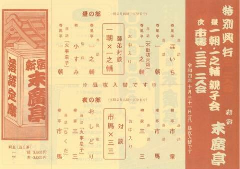 新宿末廣亭10月余一会「一朝・一之輔 親子会」 22/10/31(月) 新宿末広亭 シェア ツイート 上演情報 ジャンル 落語/演芸 入場時の手の消毒、および検温の実施。場内でのマスク着用。場内での食事(菓子類含む)・飲酒は禁止(ソフトドリンクは可)。公演内容に関する詳細はhttp://suehirotei.com/まで。 料金 一階席-3,500円二階席-3,500円 二階席-整理番号付き 表示できるチケット情報はありません詳しくはこちら キャスト&スタッフ メイン 春風亭一之輔 春風亭一朝 お問い合わせ 新宿末広亭 シェア ツイート