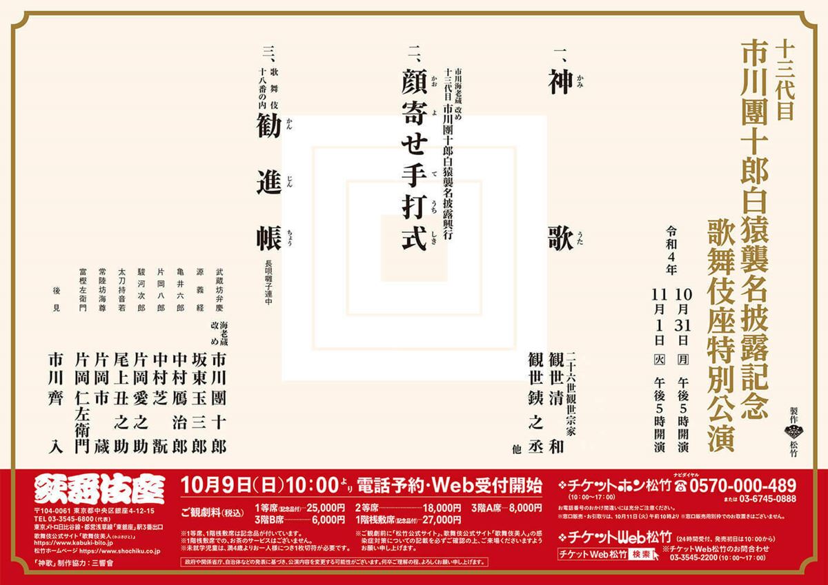 十三代目市川團十郎白猿襲名披露記念 歌舞伎座特別公演 22/10/31(月)~22/11/1(火) 歌舞伎座 シェア ツイート 演目一、『神歌』二、『顔寄せ手打式』三、『歌舞伎十八番の内 勧進帳』 上演情報 ジャンル 歌舞伎 料金 1等席(記念品付)-25,000円2等席-18,000円3階A席-8,000円3階B席-6,000円1階桟敷席(記念品付)-27,000円 キャスト&スタッフ 出演 観世清和 観世銕之丞 市川團十郎 坂東玉三郎 中村鴈治郎 中村芝翫 片岡愛之助 尾上丑之助 片岡市蔵 片岡仁左衛門 市川齊入 『神歌』観世清和 / 観世銕之丞 / 他『歌舞伎十八番の内 勧進帳』市川團十郎 / 坂東玉三郎 / 中村鴈治郎 / 中村芝翫 / 片岡愛之助 / 尾上丑之助 / 片岡市蔵 / 片岡仁左衛門 / 市川齊入 お問い合わせ チケットホン松竹 10:00~17:00 公式サイト シェア ツイート