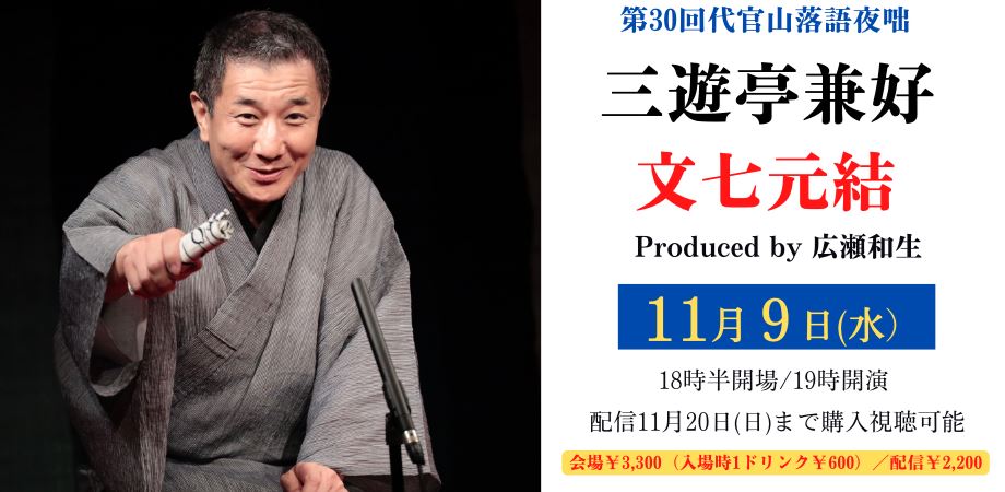 第30回 代官山落語夜咄 三遊亭兼好ひとり会『文七元結』Produced by 広瀬和生 22/11/9(水)~22/11/20(日) 晴れたら空に豆まいて、 その他映像 / 音声配信 シェア ツイート 上演情報 ジャンル 落語/演芸 料金 観覧-3,300円配信-2,200円 ※観覧は1ドリンク代600円別途※配信はご祝儀オプションあり キャスト&スタッフ 出演 三遊亭兼好 広瀬和生 お問い合わせ 晴れたら空に豆まいて 公式サイト シェア ツイート