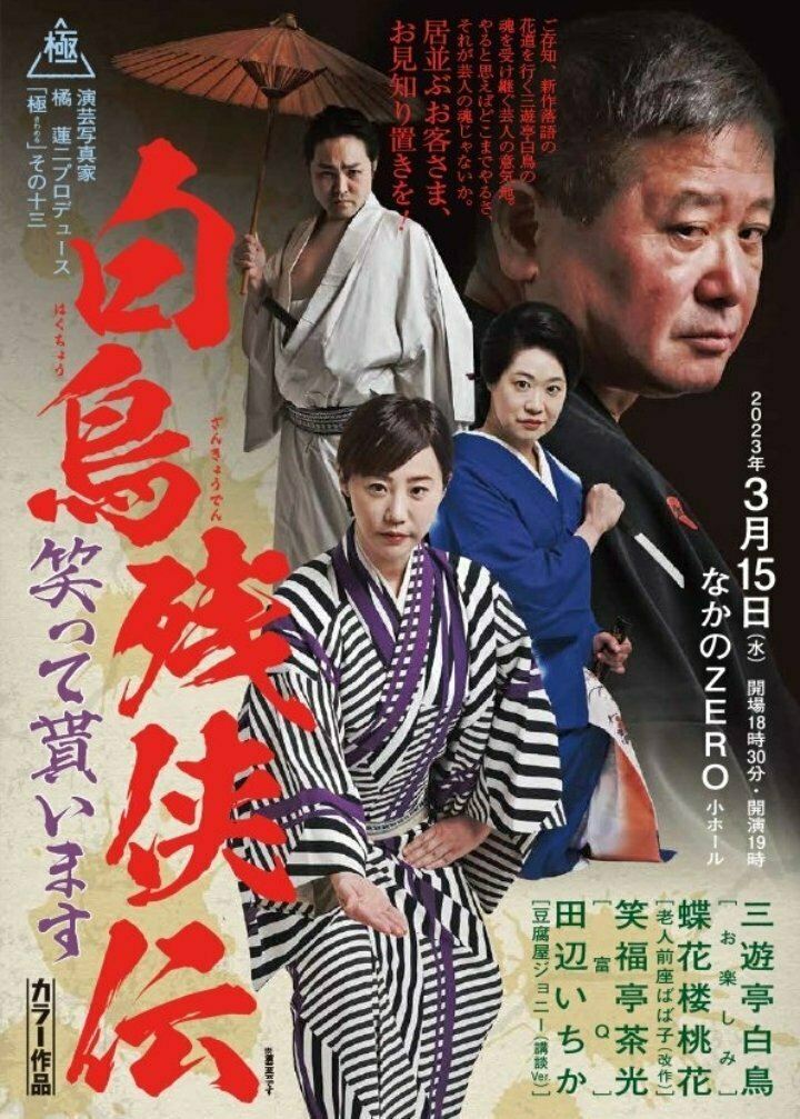演芸写真家 橘蓮二プロデュース "極"Vol.13 白鳥残侠伝 ~笑って貰います~ 23/3/15(水) なかのZERO 小ホール シェア ツイート 上演情報 ジャンル 落語/演芸 未就学児童は入場不可。 料金 一般-3,700円 全席指定 表示できるチケット情報はありません詳しくはこちら キャスト&スタッフ 出演 三遊亭白鳥 蝶花楼桃花 笑福亭茶光 田辺いちか [出演]三遊亭白鳥 / 蝶花楼桃花 / 笑福亭茶光 / 田辺いちか お問い合わせ 夢空間 公式サイト シェア ツイート