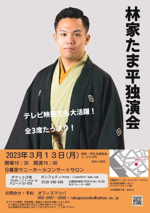 林家たま平独演会 23/3/13(月) 日暮里サニーホール コンサートサロン シェア ツイート テレビで映画で大活躍の噺家 林家たま平の独演会 上演情報 ジャンル 落語/演芸 当日2500円 中止延期以外の払い戻しはおこなっておりませんので、ご了承の上、ご購入ください。マスクの着用・手指の消毒・検温にご協力をお願いいたします。 料金 一般-2,200円 全席自由 表示できるチケット情報はありません詳しくはこちら キャスト&スタッフ 出演 林家たま平 [出演]林家たま平 お問い合わせ オフィスマツバ 公式サイト シェア ツイート