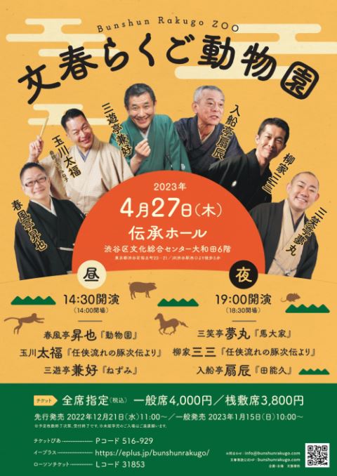 文春らくご動物園 23/4/27(木) 渋谷区文化総合センター大和田 伝承ホール シェア ツイート すべての写真(2)を見る すべての写真(2)を見る 上演情報 ジャンル 落語/演芸 未就学児童は入場不可。 料金 一般-4,000円桟敷席-3,800円 全席指定 表示できるチケット情報はありません詳しくはこちら キャスト&スタッフ 出演 三遊亭兼好 玉川太福 春風亭昇也 入船亭扇辰 柳家三三 三笑亭夢丸 お問い合わせ 文藝春秋 公演内容の詳細に関する問い合わせ 公式サイト シェア ツイート