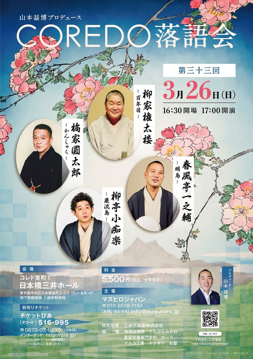 第33回『COREDO落語会』 23/3/26(日) 日本橋三井ホール シェア ツイート 上演情報 ジャンル 落語/演芸 公演内容に関する詳細はinfo@masuhiro.jpまで。 料金 一般-5,500円 全席指定 表示できるチケット情報はありません詳しくはこちら キャスト&スタッフ 出演 柳家権太楼 春風亭一之輔 橘家圓太郎 柳亭小痴楽 [出演]柳家権太楼 / 春風亭一之輔 / 橘家圓太郎 / 柳亭小痴楽 お問い合わせ マスヒロジャパン 公演に関する問い合わせ 公式サイト シェア ツイート