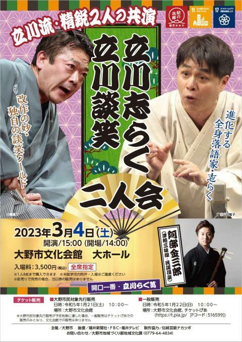 立川志らく・立川談笑 二人会 23/3/4(土) 大野市文化会館 大ホール シェア ツイート テレビ・ラジオ等で現在活躍中の人気落語家、立川志らくと立川談笑による夢の共演 上演情報 ジャンル 落語/演芸 本券はいかなる場合も再発行いたしません。不可抗力により開催を中止する以外は、料金の払い戻しはいたしません。マスク着用・検温・消毒のご協力をお願いします。チケット半券裏面に氏名・お電話番号を記入の上ご来場ください。未就学児の同伴・入場はご遠慮ください。 料金 一般-3,500円 表示できるチケット情報はありません詳しくはこちら キャスト&スタッフ 出演 立川志らく 立川談笑 [出演]立川志らく / 立川談笑 お問い合わせ 大野市地域づくり部地域文化課 公式サイト シェア ツイート