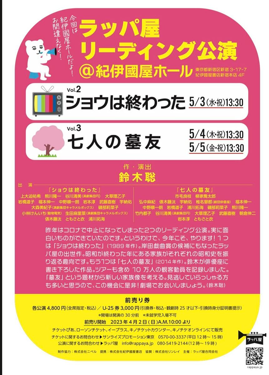 [作]鈴木聡 [演出]鈴木聡 [出演]市毛良枝 / 柳家喬太郎 / 弘中麻紀 / 俵木藤汰 / 宇納佑 / 椎名慧都 / 福本伸一 / 中野順一朗 / 岩橋道子 / 浦川拓海 / 磯部莉菜子 / 熊川隆一 / 竹内都子 / 谷川清美 / 大草理乙子 / 武藤直樹 / 朝倉伸二 / 岩本淳 / ともさと衣
