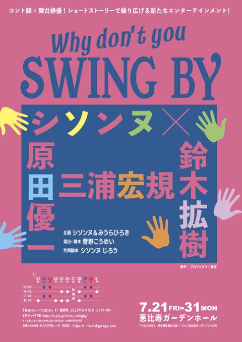 Why don't you SWING BY ? 23/7/21(金)~23/7/31(月) 恵比寿ザ・ガーデンホール シェア ツイート すべての写真(2)を見る コント師×舞台俳優!ショートストーリーで繰り広げる、新たなエンターテインメント! すべての写真(2)を見る 上演情報 ジャンル 大・中劇場 上演時間:1時間40分(休憩なし)予定 未就学児童は入場不可。 料金 一般-11,000円当日引換券-11,000円 全席指定 表示できるチケット情報はありません詳しくはこちら キャスト&スタッフ 出演 シソンヌ 三浦宏規 原田優一 鈴木拡樹 [出演]シソンヌ / 三浦宏規 / 原田優一 / 鈴木拡樹 お問い合わせ ディスクガレージ 公式サイト シェア ツイート
