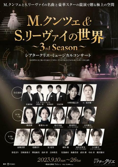 M.クンツェ&S.リーヴァイの世界 ~3rd Season~ 23/9/10(日)~23/9/26(火) シアタークリエ シェア ツイート 上演情報 ジャンル ミュージカル 未就学児童は入場不可。本公演チケットを「チケット不正転売禁止法」の対象となる「特定興行入場券」として販売致します。興行主の同意のない有償譲渡は禁止されています。要身分証明書。 料金 一般-13,000円 全席指定 表示できるチケット情報はありません詳しくはこちら キャスト&スタッフ 出演 LE VELVETS 小野田龍之介 一路真輝 愛希れいか 和音美桜 古川雄大 新妻聖子 涼風真世 花總まり 昆夏美 城田優 田代万里生 上口耕平 司会 原田優一 お問い合わせ 東宝テレザーブ 公式サイト シェア ツイート