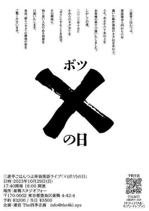 三遊亭ごはんつぶ単独落語ライブ『×(ボツ)の日』 23/10/29(日) studio FOUR シェア ツイート 上演情報 ジャンル 落語/演芸 料金 一般-3,200円 全席自由 表示できるチケット情報はありません詳しくはこちら キャスト&スタッフ 出演 三遊亭ごはんつぶ [出演]三遊亭ごはんつぶ お問い合わせ The四季企画 公式サイト シェア ツイート