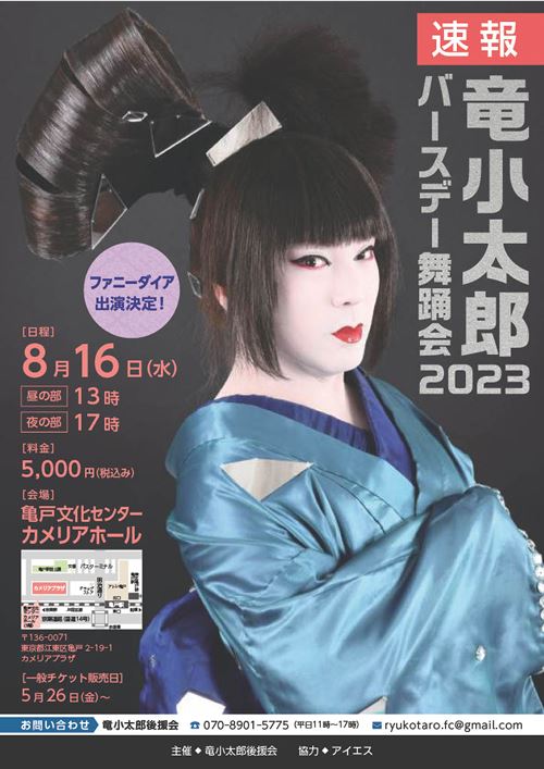 竜小太郎バースデー舞踊会2023 23/8/16(水) 亀戸文化センター カメリアホール シェア ツイート 上演情報 ジャンル 大・中劇場 未就学児童は入場不可。車椅子での来場はチケット購入前問合せ先まで要連絡。公演当日の感染症対策にご協力ください。 料金 一般-5,000円 全席指定 表示できるチケット情報はありません詳しくはこちら キャスト&スタッフ 出演 竜小太郎 ゲスト 沢田みなみ 夢乃真稀 真弥優希 瀧山うさぎ 千布ゆきな 朱璃まひろ 浅井ひとみ 田代大悟 榎本ゆう メイン 竜小太郎 [出演]竜小太郎 [ゲスト]沢田みなみ / 夢乃真稀 / 真弥優希 / 瀧山うさぎ / 千布ゆきな / 朱璃まひろ / 浅井ひとみ / 田代大悟 / 榎本ゆう お問い合わせ 竜小太郎後援会 公式サイト シェア ツイート