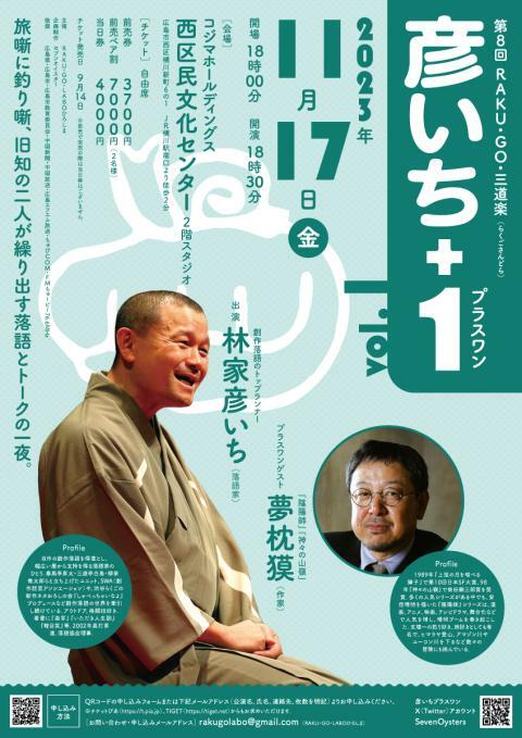 第8回RAKU・GO・三道楽『彦いちプラスワン Vol.1』 23/11/17(金) コジマホールディングス西区民文化センター スタジオ シェア ツイート 新作落語のリーダー、林家彦いち独演会+ゲスト夢枕獏とのトーク。落語とオトナの道楽話を広島で楽しむ。 上演情報 ジャンル 落語/演芸 本サイトで予定枚数終了の場合は、rakugolabo@gmail.comにメールで残券確認可能。 料金 一般-3,700円 全席自由 表示できるチケット情報はありません詳しくはこちら キャスト&スタッフ 出演 林家彦いち ゲスト 夢枕獏 [出演]林家彦いち [ゲスト]夢枕獏 お問い合わせ RAKU・GO・LABOひろしま(留守電対応) RAKU・GO・LABO チケットに関する問い合わせ 公式サイト シェア ツイート