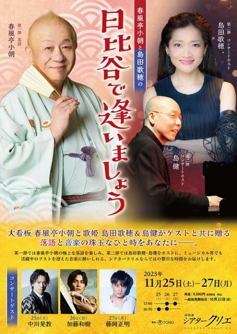 春風亭小朝と島田歌穂の『日比谷で逢いましょう』 23/11/25(土)~23/11/27(月) シアタークリエ シェア ツイート 上演情報 ジャンル 落語/演芸 未就学児童は入場不可。本公演チケットを「チケット不正転売禁止法」の対象となる「特定興行入場券」として販売致します。興行主の同意のない有償譲渡は禁止されています。要身分証明書。 料金 一般-9,500円 全席指定 表示できるチケット情報はありません詳しくはこちら キャスト&スタッフ 出演 春風亭小朝 島田歌穂 島健 ゲスト 中川晃教 加藤和樹 藤岡正明 お問い合わせ 東宝テレザーブ 公式サイト シェア ツイート