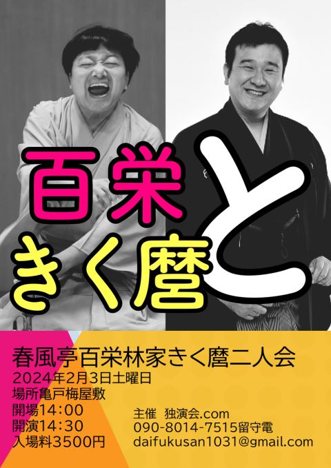 春風亭百栄林家きく麿二人会~百栄ときく麿~ 24/2/3(土) 亀戸梅屋敷 シェア ツイート ありそうでなかった第二回春風亭百栄林家きく麿二人会。お二人のトークコーナーあります。 上演情報 ジャンル 落語/演芸 料金 一般-3,500円 全席自由 表示できるチケット情報はありません詳しくはこちら キャスト&スタッフ 出演 春風亭百栄 林家きく麿 [出演]春風亭百栄 / 林家きく麿 お問い合わせ 独演会.com 公式サイト シェア ツイート