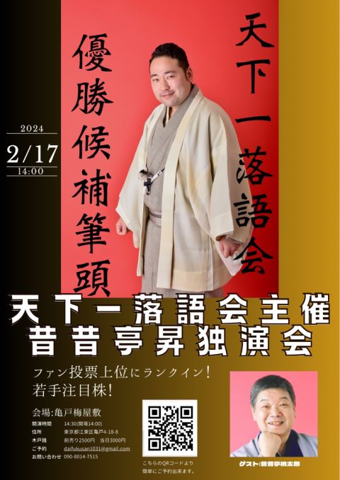 昔昔亭昇独演会 24/2/17(土) 亀戸梅屋敷 シェア ツイート 昔昔亭昇さんの独演会です。ゲストに昔昔亭桃太郎師匠が出演されます。 上演情報 ジャンル 落語/演芸 料金 一般-2,500円 表示できるチケット情報はありません詳しくはこちら キャスト&スタッフ 出演 昔昔亭全太郎 昔昔亭桃太郎 [出演]昔昔亭昇 / 昔昔亭桃太郎 お問い合わせ 天下一落語会 公式サイト シェア ツイート