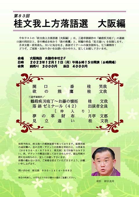 桂文我上方落語選 大阪編 23/12/11(月) 太融寺本坊 シェア ツイート 上演情報 ジャンル 落語/演芸 料金 前売-3,000円当日-4,000円 小学生以下は入場不可 表示できるチケット情報はありません詳しくはこちら キャスト&スタッフ 出演 桂文我 月亭文都 桂笑我 [出演]桂文我(「欲の熊鷹」「三遊亭圓朝作/鶴殺疾刃庖丁~お藤の懐妊」「見立違い」) / 月亭文都(「夢の革財布」) / 桂笑我(「開口一番」) お問い合わせ 桂文我の会事務局 公式サイト シェア ツイート