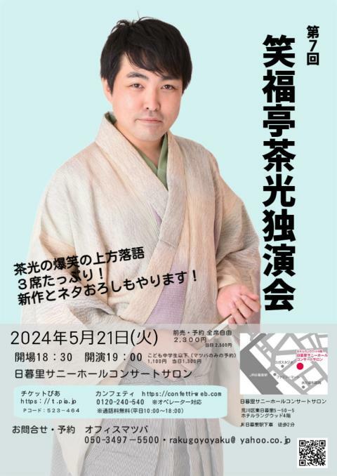 第7回 笑福亭茶光独演会 24/5/21(火) 日暮里サニーホール コンサートサロン シェア ツイート 大人気の二ッ目 笑福亭茶光の独演会です 上演情報 ジャンル 落語/演芸 料金 一般-2,300円 全席自由当日+200円 表示できるチケット情報はありません詳しくはこちら キャスト&スタッフ 出演 笑福亭茶光 [出演]笑福亭茶光 お問い合わせ オフィスマツバ 公式サイト シェア ツイート