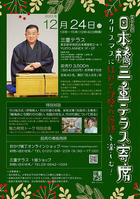 三重テラス寄席 ~クリスマスに江戸で伊勢の落語を楽しむ~ 23/12/24(日) 三重テラス イベントスペース シェア ツイート 上演情報 ジャンル 落語/演芸 小学生以下は入場不可。 料金 一般-3,500円 表示できるチケット情報はありません詳しくはこちら キャスト&スタッフ 出演 桂文我 ゲスト 竹川裕久 [出演]桂文我(「百人坊主」他) [ゲスト]竹川裕久(伊勢商人・竹川竹斎の末裔) お問い合わせ 桂文我の会事務局 公式サイト シェア ツイート