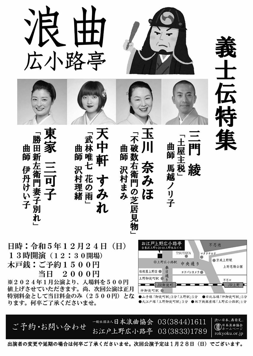 浪曲広小路亭 23/12/24(日) お江戸上野広小路亭 シェア ツイート 上演情報 ジャンル 落語/演芸 料金 前売:1,500円当日:2,000円 キャスト&スタッフ 出演 三門綾 玉川奈みほ 天中軒すみれ 東屋三可子 お問い合わせ お江戸上野広小路亭 公式サイト シェア ツイート