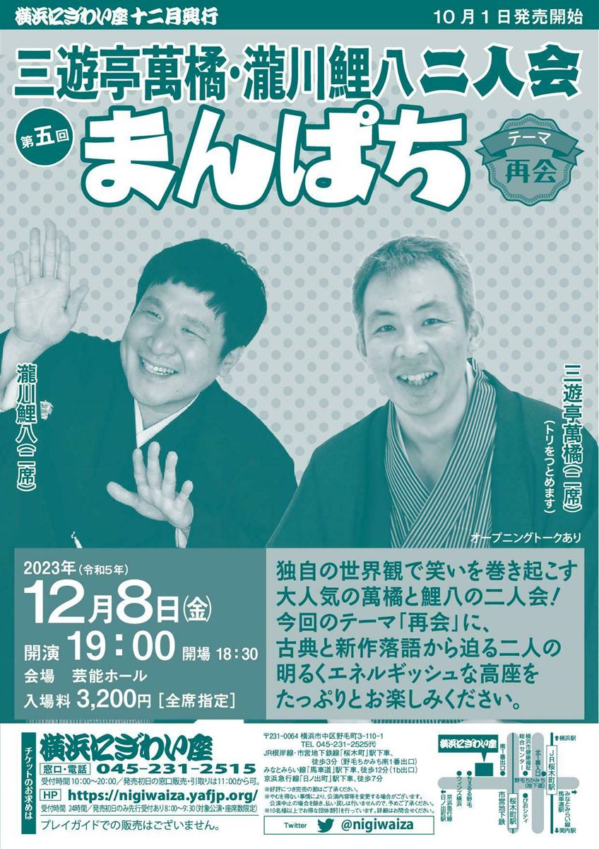 第五回 まんぱち~三遊亭萬橘・瀧川鯉八 二人会 23/12/8(金) 横浜にぎわい座 芸能ホール シェア ツイート 上演情報 ジャンル 落語/演芸 料金 全席指定:3,200円 キャスト&スタッフ 出演 三遊亭萬橘 瀧川鯉八 お問い合わせ 横浜にぎわい座 公式サイト シェア ツイート