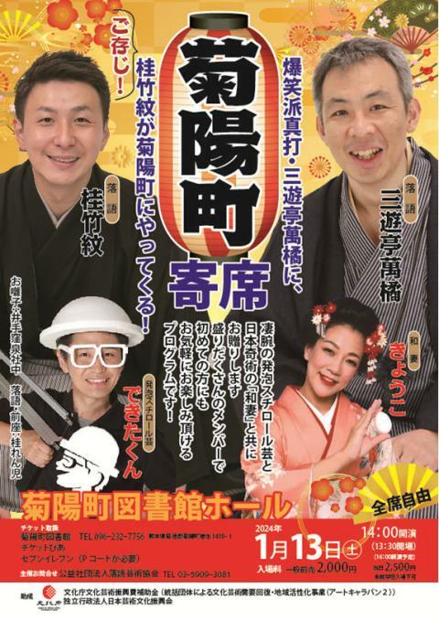 菊陽町寄席 24/1/13(土) 菊陽町図書館ホール シェア ツイート 爆笑派真打・三遊亭萬橘と地元出身でご存じ!桂竹紋の楽しい落語会! 上演情報 ジャンル 落語/演芸 未就学児童入場不可 料金 一般-2,000円 全席自由 表示できるチケット情報はありません詳しくはこちら キャスト&スタッフ 出演 三遊亭萬橘 桂竹紋 できたくん きょうこ 桂れん児 井手窪泉 [出演]三遊亭萬橘 / 桂竹紋 / できたくん / きょうこ / 桂れん児 / 井手窪泉 お問い合わせ 公益社団法人落語芸術協会 公式サイト シェア ツイート